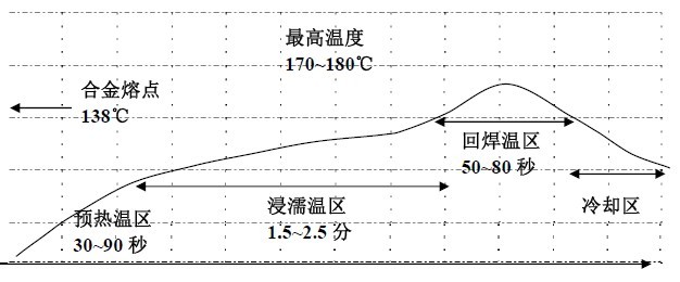 推薦的回流曲線適用于大多數(shù)錫/鉍(Sn42/Bi58)合金的低溫錫膏,在使用 (Sn42/Bi58)時,可把它作為建立回流工作曲線的參考,回焊曲線要根據(jù)具體的工序要求(包括:線路板的尺寸、厚度、密度)來設(shè)定的,它有可能是偏離此推薦值的。